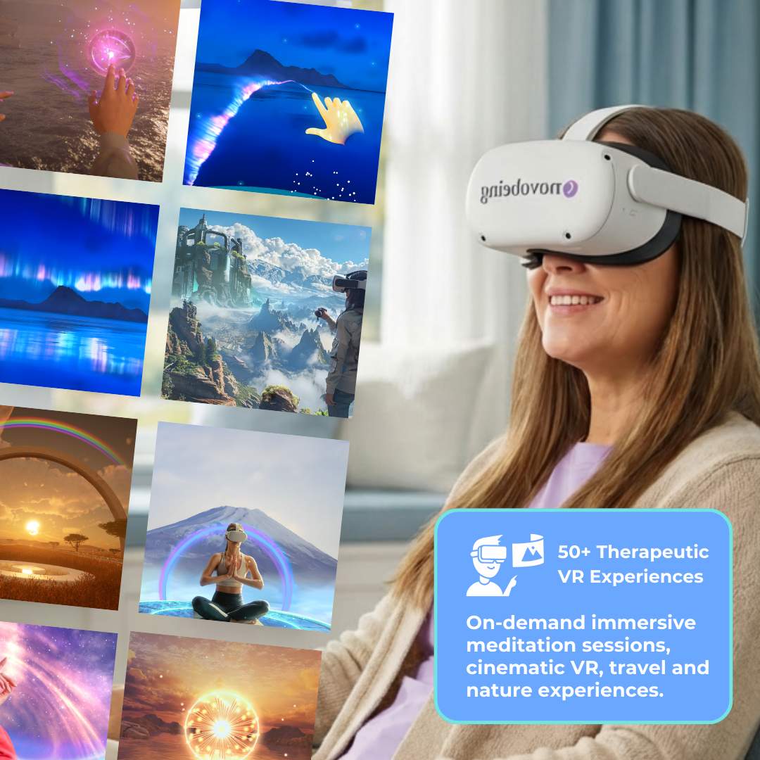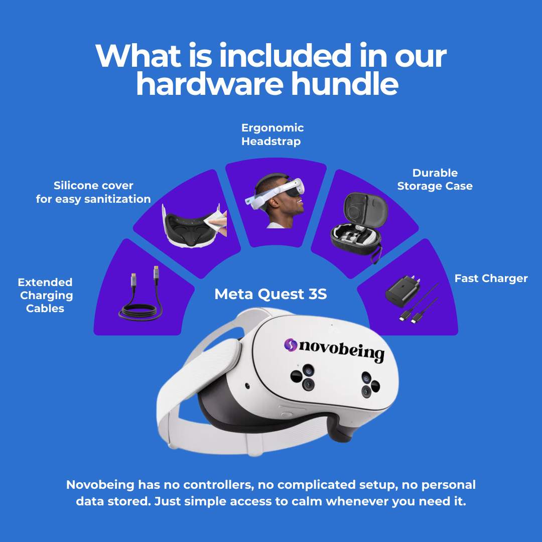 You’ll receive a preconfigured Meta Quest 3S headset, comfort strap, silicone protector, fast charger, quick-start guide, and full access to 50+ therapeutic experiences. Everything arrives ready to use.